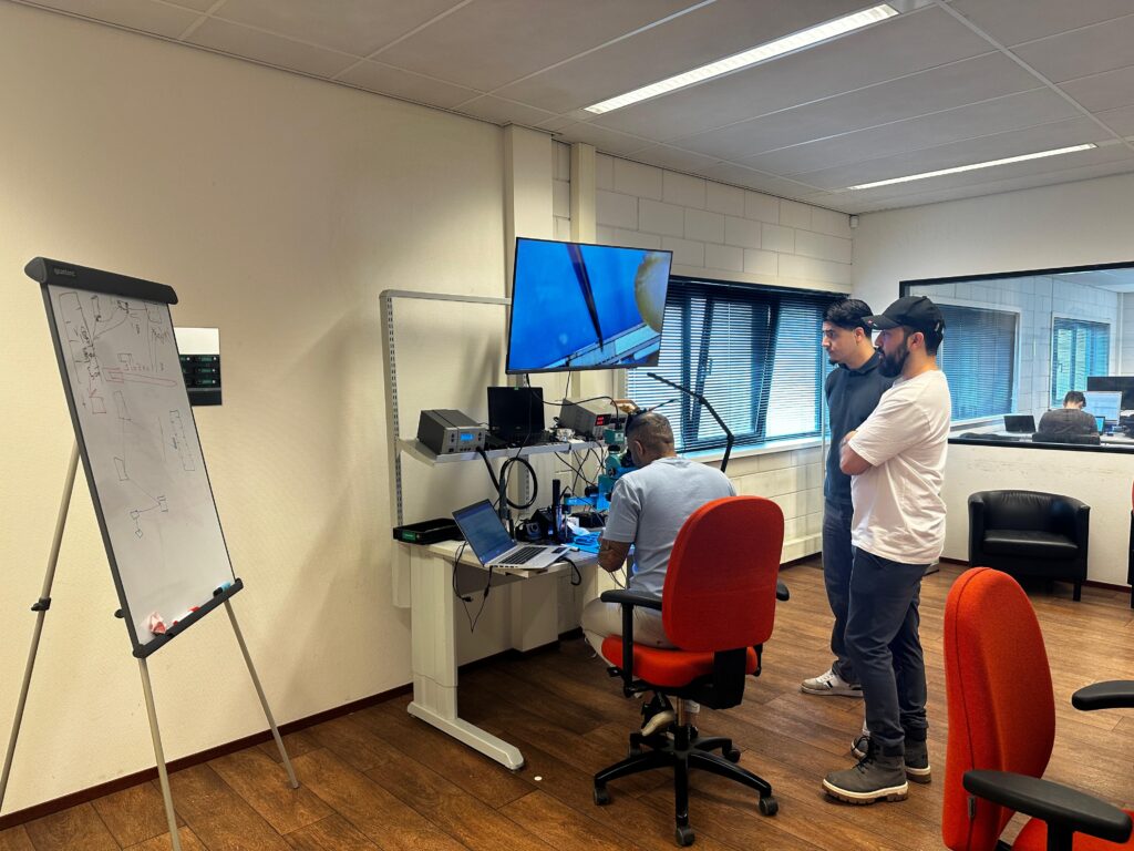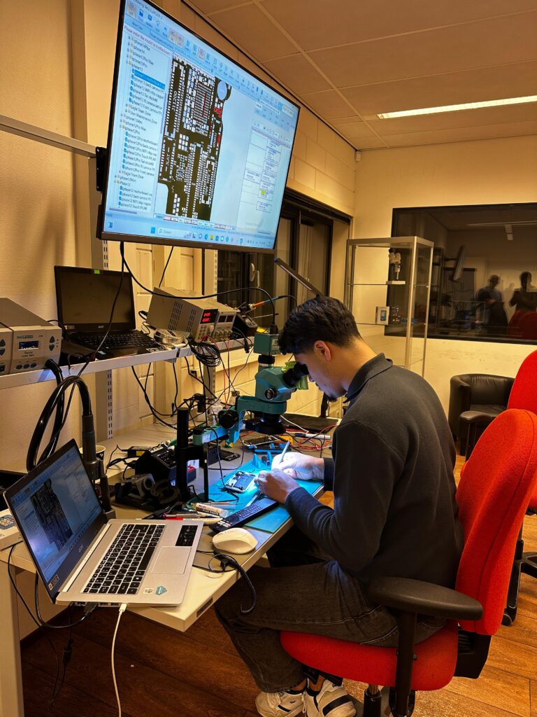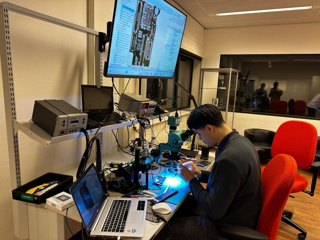 Tijdens de praktijkonderdelen werkte Student B nauw samen met andere cursisten. Het was mooi om te zien hoe ze elkaar hielpen en tips uitwisselden. Op de foto’s zie je Student B bezig met het inspecteren van printplaten via een microscoop en het uitvoeren van soldeerhandelingen met uiterste precisie. De grote monitor boven de werktafel hielp hem om het moederbord tot in detail te bestuderen.